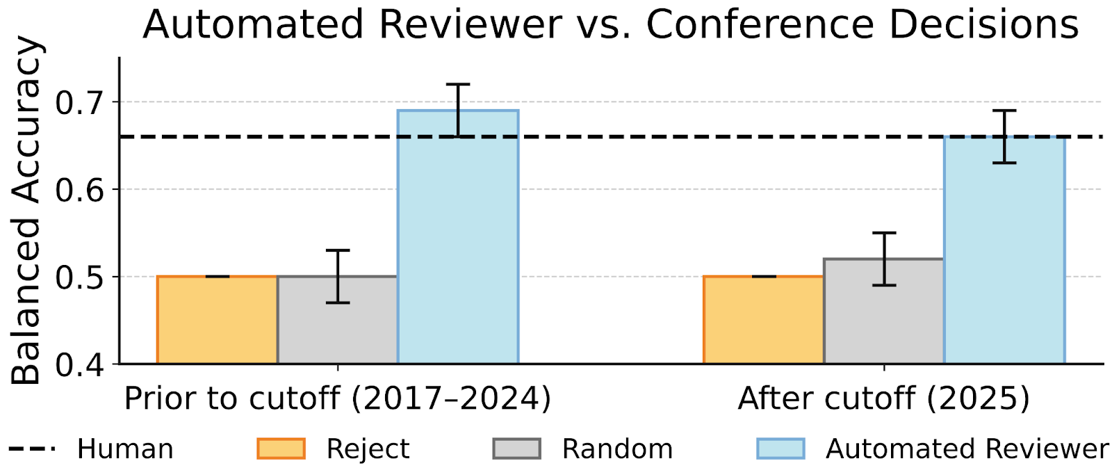 The Automated Reviewer matches human review judgments on AI papers published at a top conference (ICLR), including papers published after the model was trained (its “knowledge cutoff”). These results suggest The Automated Reviewer is as reliable as human reviewers at providing review scores for newly written AI papers.