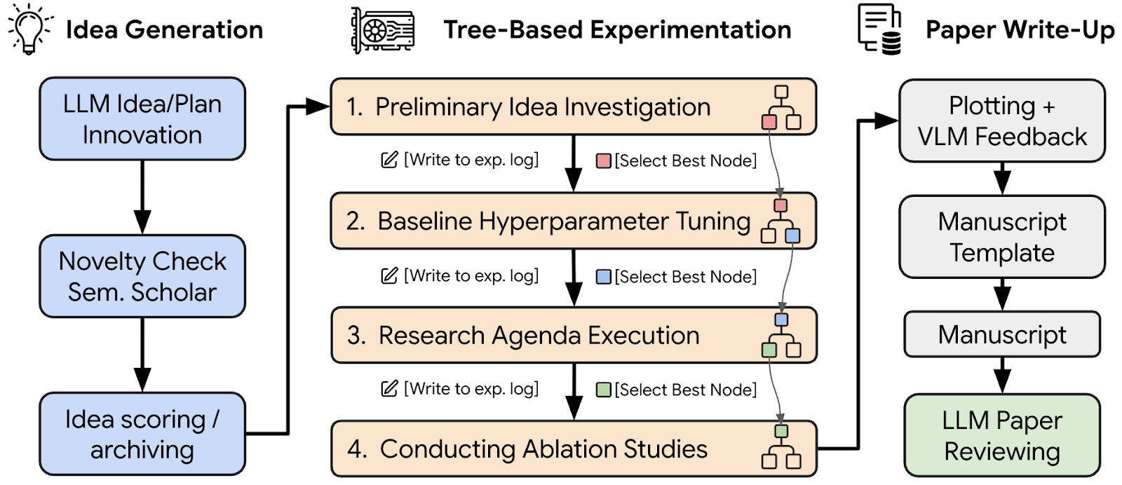 This new Nature paper consolidates these breakthroughs and dives deep into the underlying foundation model improvements that makes them possible. Under the hood, after being given a broad research direction, it autonomously generates of novel research ideas, searches for and reads the relevant literature, designs, programs, and conducts experiments via parallelized agentic tree search, and writes the entire paper (in LaTeX, with feedback on its figures coming from a foundation model with vision capabilities).