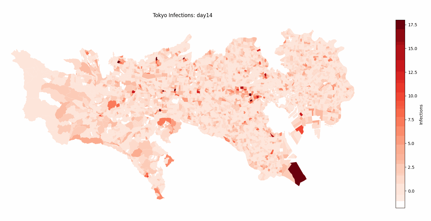 東京都における感染拡大予測のためのエージェントベースの人口移動モデルの実行例