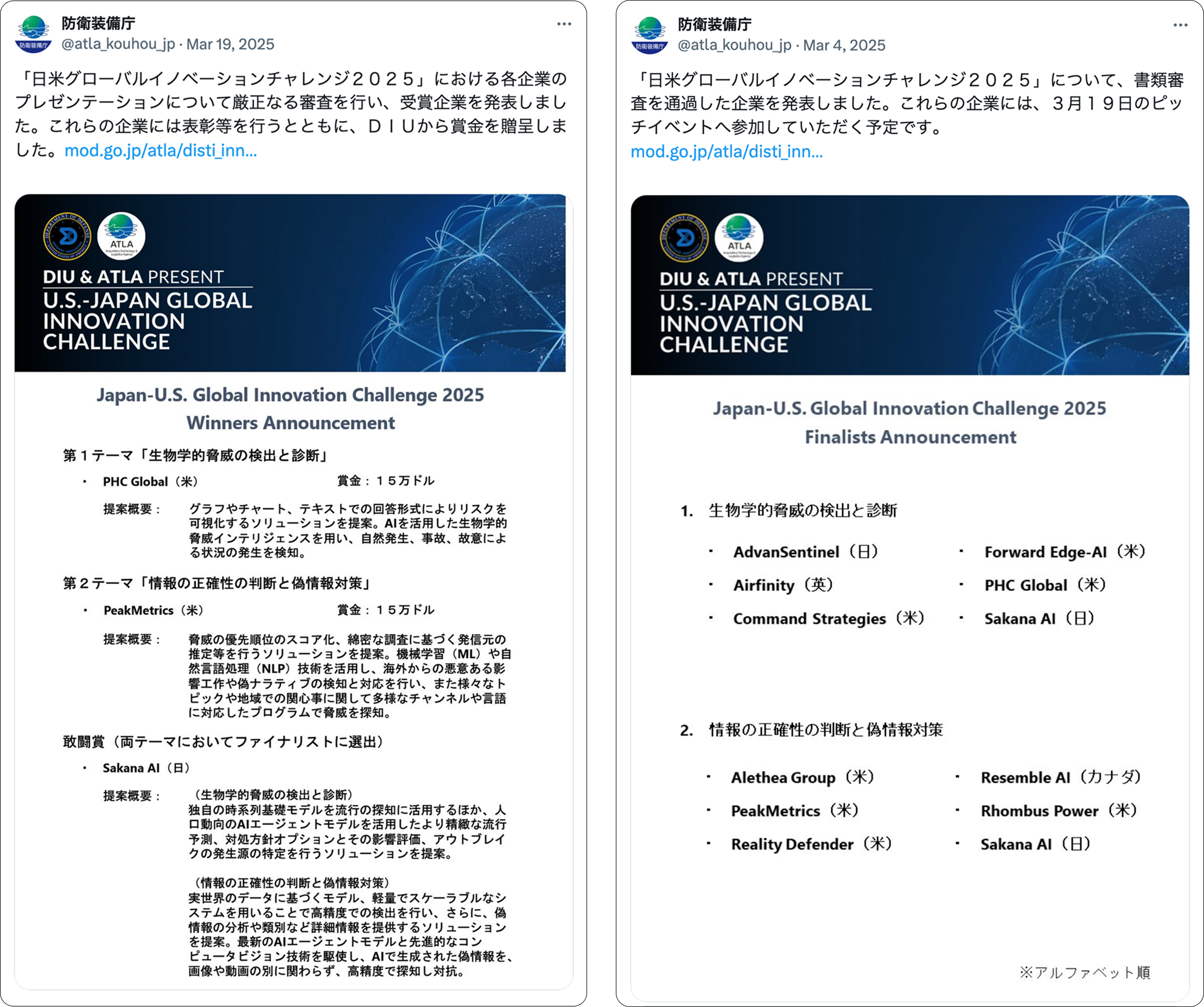 「日米グローバルイノベーションチャレンジ2025」は、日本の防衛装備庁と米国国防総省傘下のDefense Innovation Unit(DIU)が主催するスタートアップ向けプログラムであり、バイオセキュリティや偽情報対策に貢献する新たな技術を開発する企業を発掘し、防衛イノベーションを推進することを目的とするものです。