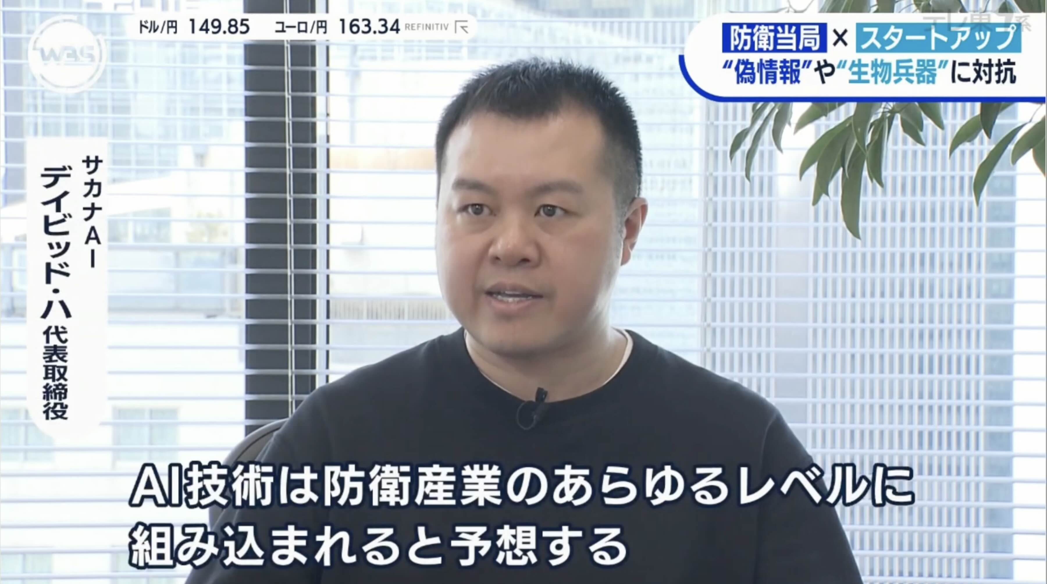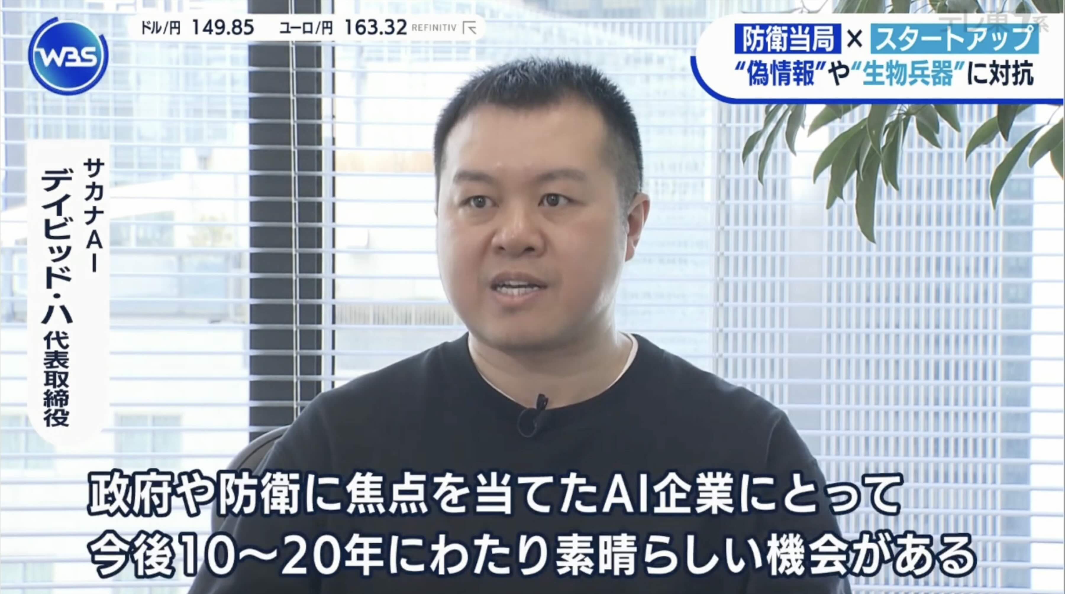 テレビ東京のニュース番組「WBS」にて、今後10年間のAI、地政学、政府の在り方、防衛の動向についての考えを語ったSakana AIのデイビッド・ハCEO。