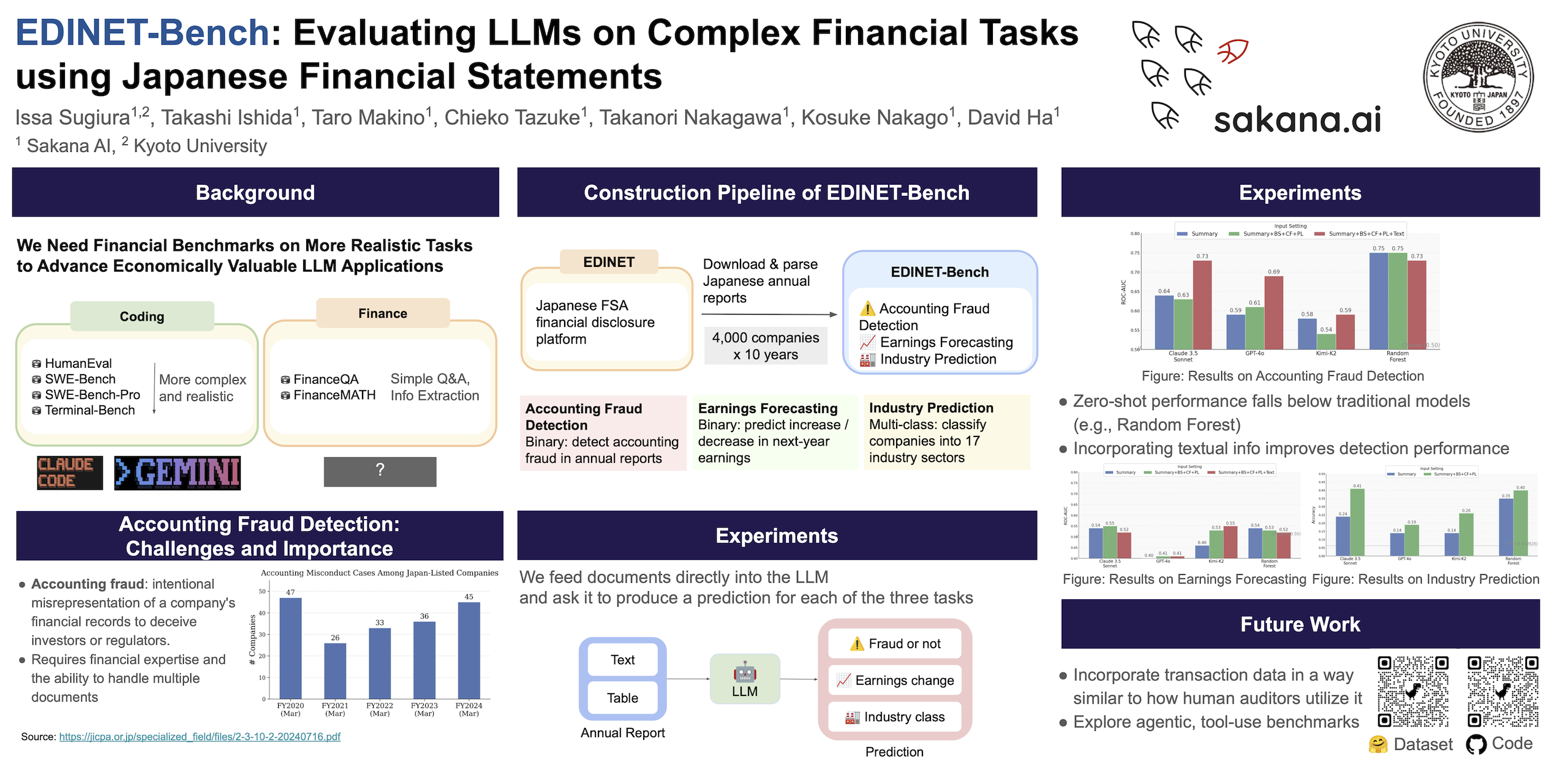 Sakana AIはこのたび、会計不正検知をはじめとする高度な金融タスクにおける大規模言語モデル(LLM)の性能を測定する日本語金融ベンチマーク「EDINET-Bench」を開発しました。