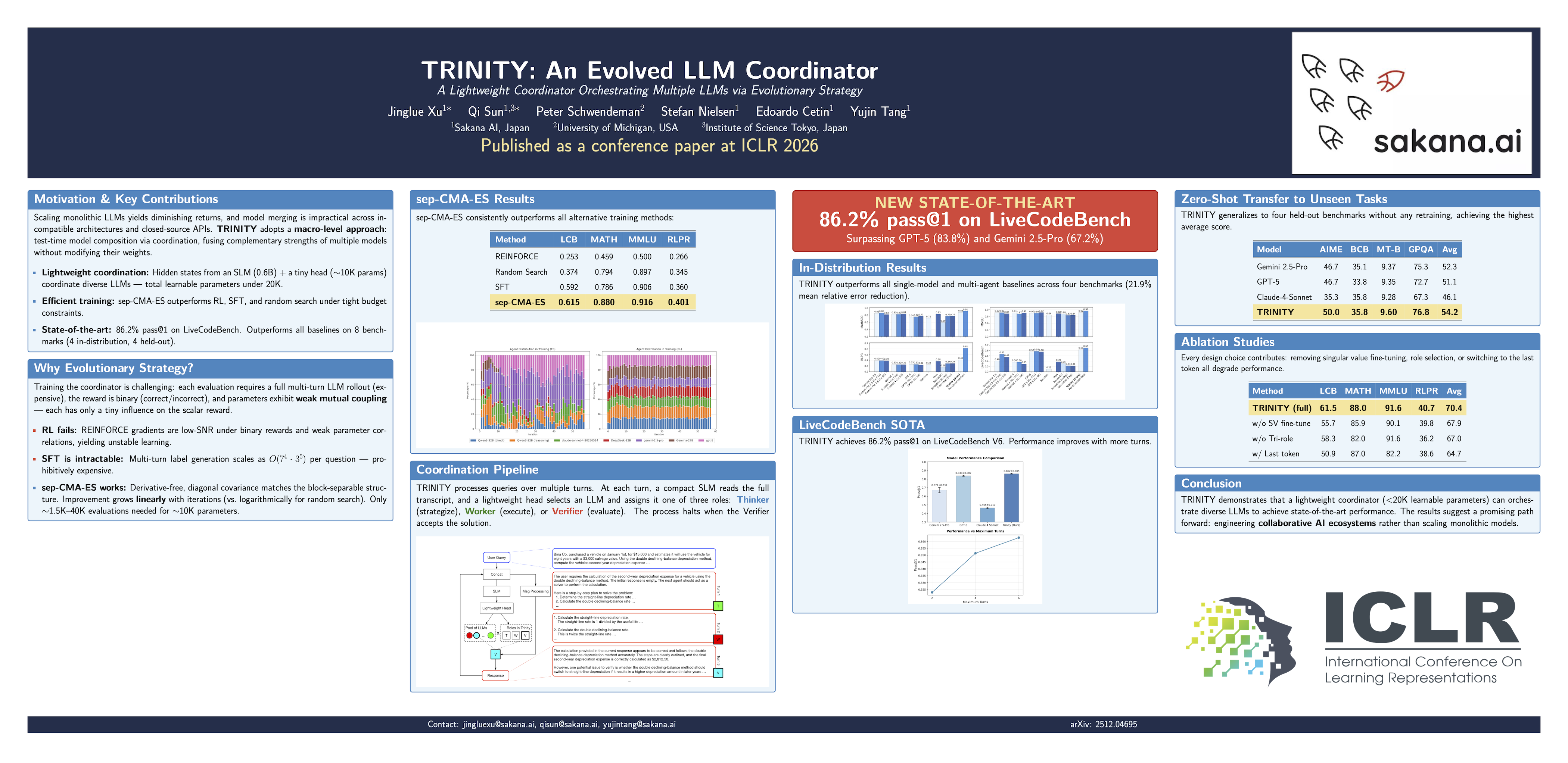 Xu, Sun, Schwendeman, Nielsen, Cetin, Tang. TRINITY: An Evolved LLM Coordinator. ICLR 2026.