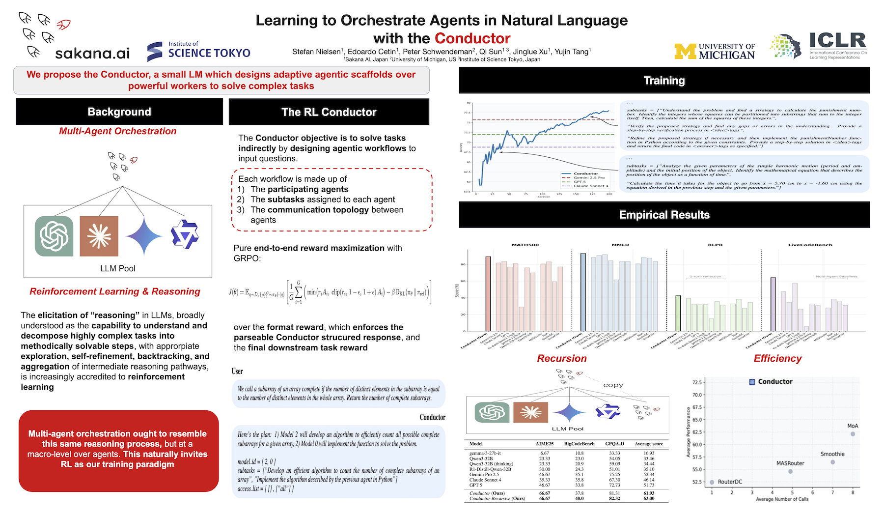 Nielsen, Cetin, Schwendeman, Sun, Xu, Tang. Learning to Orchestrate Agents in Natural Language with the Conductor. ICLR 2026.