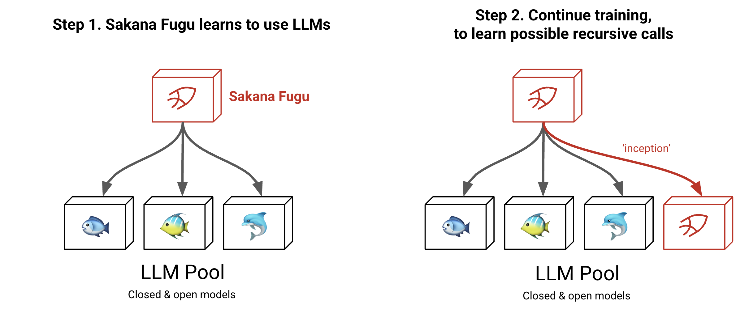 Sakana Fugu Model, which is a small language model itself, learns to call LLMs (left). In the course of training, it can learn to call itself, enabling Test-time scaling (right). The actual coordination in Sakana Fugu is adaptive and complex.
