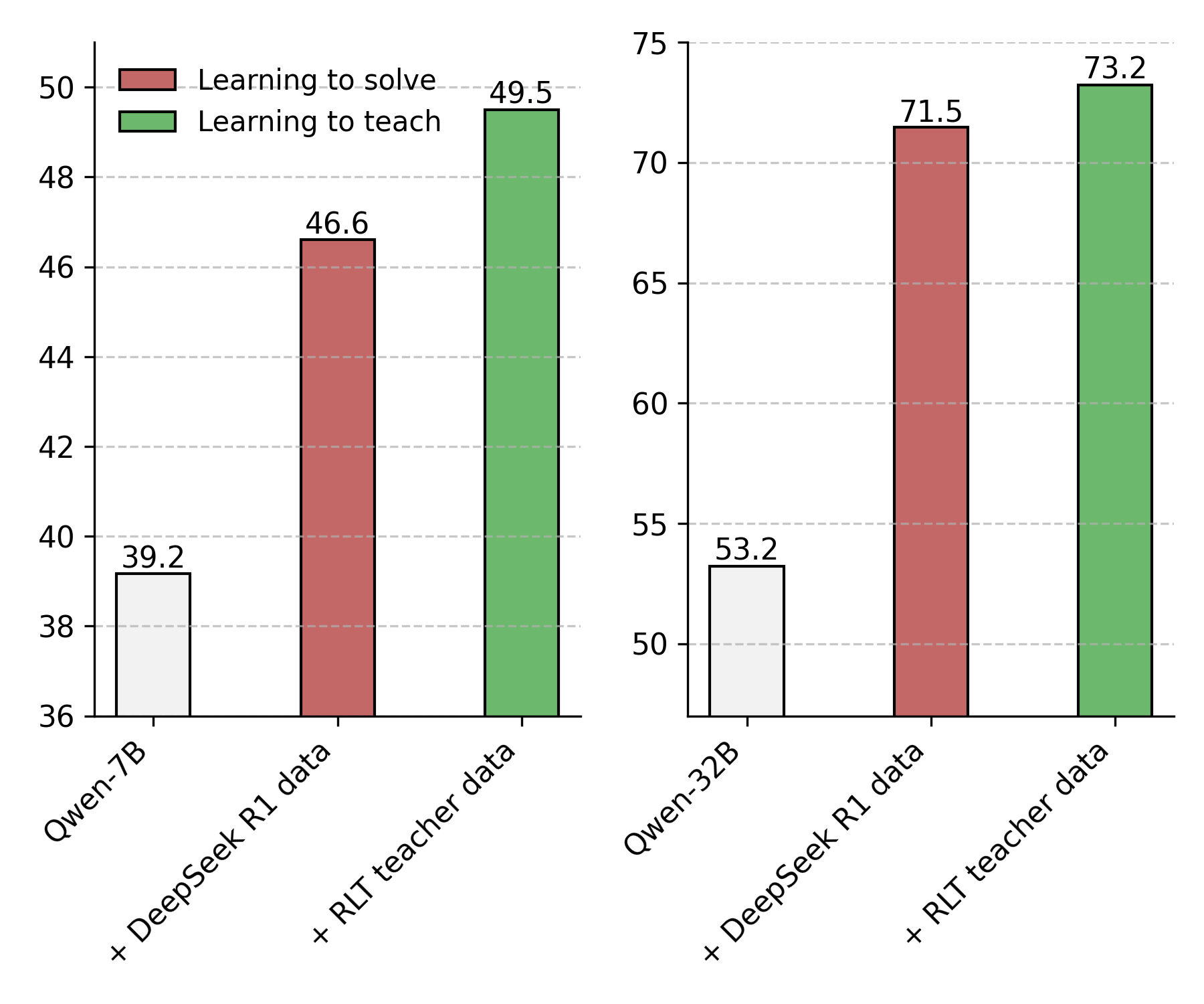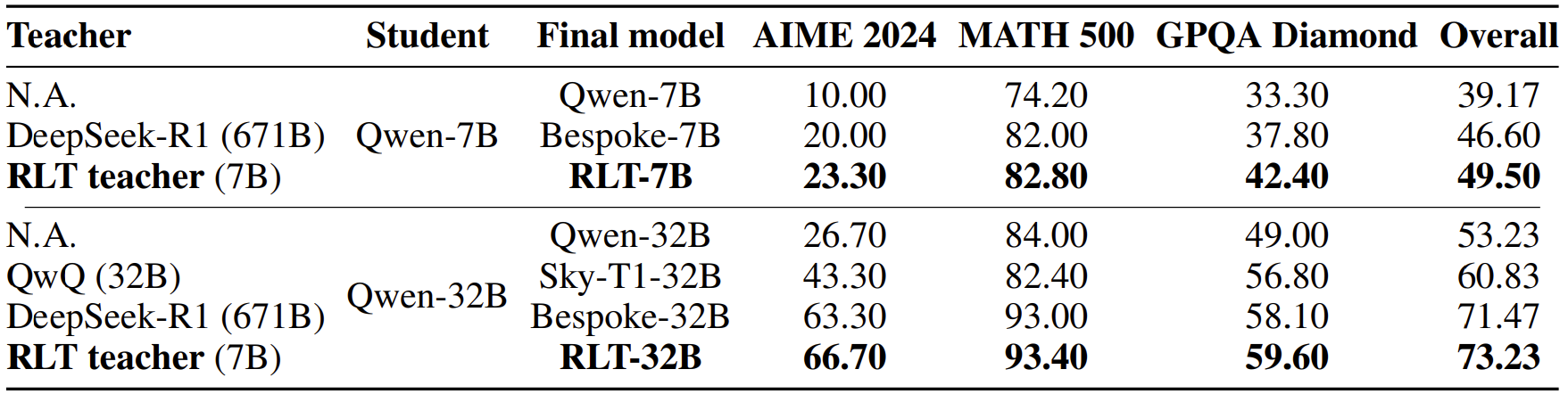 Even so, our much smaller RLT outperformed them across multiple challenging benchmarks in math and science (see table below, top group). Using the same Qwen2.5 student models, the same questions, and the same evaluation setup, our RLT delivered better results with far less computational effort. It set a new standard for both efficiency and effectiveness in teaching reasoning to language models.