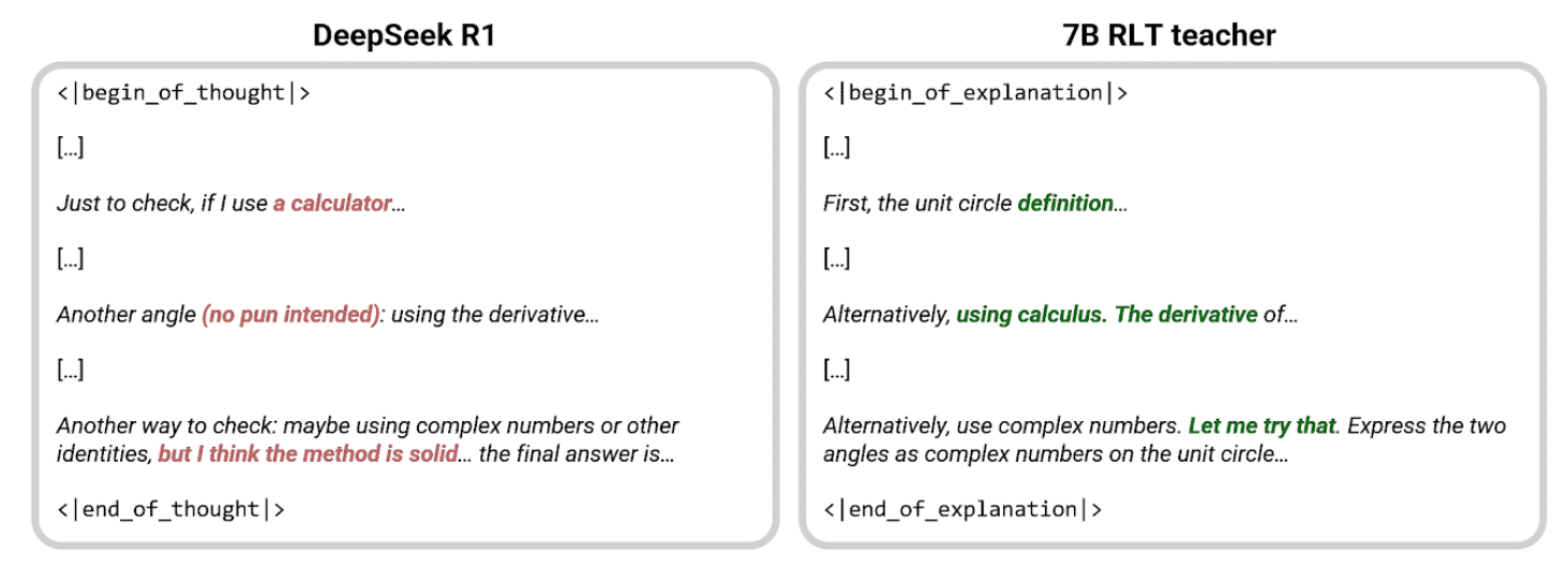 A qualitative examination reveals some differences between the explanations provided by our RLTs and the distillation traces from Deepseek R1. We find the outputs of this traditional RL model often appear to rely on external tools like calculators, and even include out-of-place language patterns such as humorous comments. In contrast, our RLT explanations are more focused and even manage to add additional logical steps omitted by R1 using a clear and direct language. These intuitive enhancements translate to improved learning for our student language models, mirroring the conciseness and clarity of expert human educators.