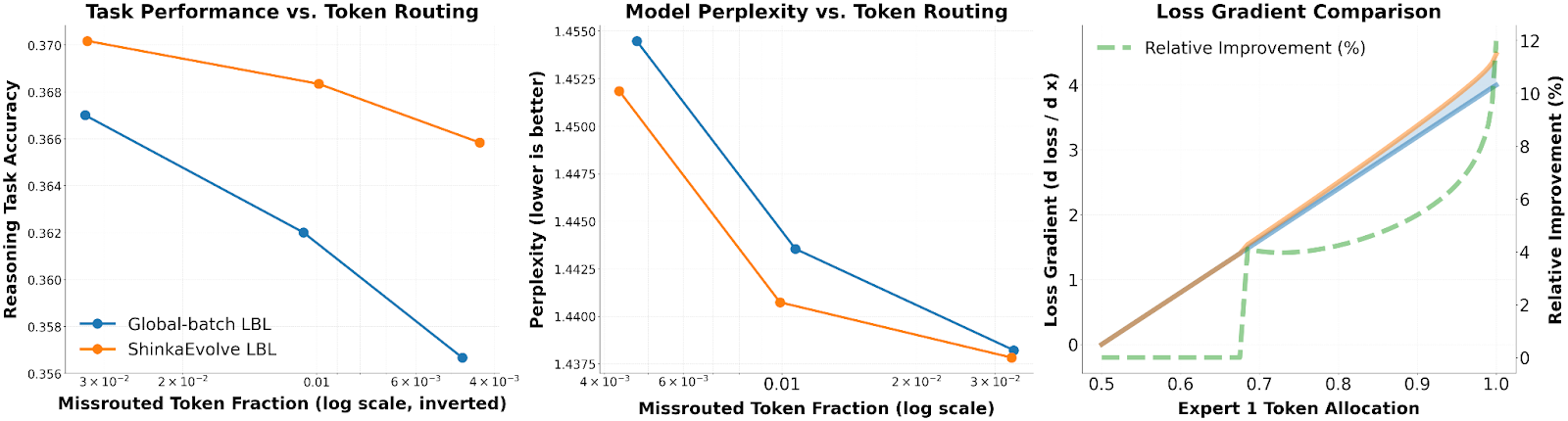 Improved LLM Training:Towards Balanced and Effective Expert Allocation. ShinkaEvolve improves on state-of-the-art load balancing loss functions with reduced inefficient token routing(-5.81%) and higher task performance (+1.73% on average). The effects of this loss adaptively activate and vanish only for particularly imbalanced LLM layers.
