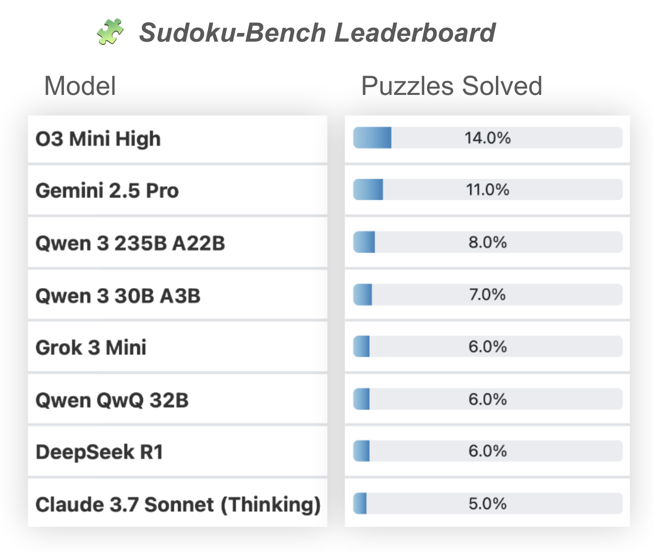 Sakana AIは、AIの多段階かつ創造的な推論能力を測定するため、数独パズルとその派生版を用いたベンチマーク「Sudoku-Bench」を2025年3月に発表しました。この度、Sudoku-Benchにおける各AIモデルの性能を評価したリーダーボードを公開しました。
